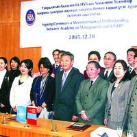 - НҮБ-ын хөгжлийн хөтөлбөрийн Монгол дахь суурин төлөөлөгч Пратиба Мета, Удирдлагын академийн захирал Т.Лхагваа гар багш нарын хамт