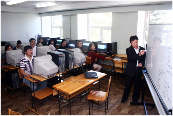 Сургалтын ажлыг цахимжуулах талаар том дэвшилд хүрлээ. Зураг дээр: Компьютер, мэдээллийн төвийн эрхлэг З.Баасанжав хичээл орж байна.