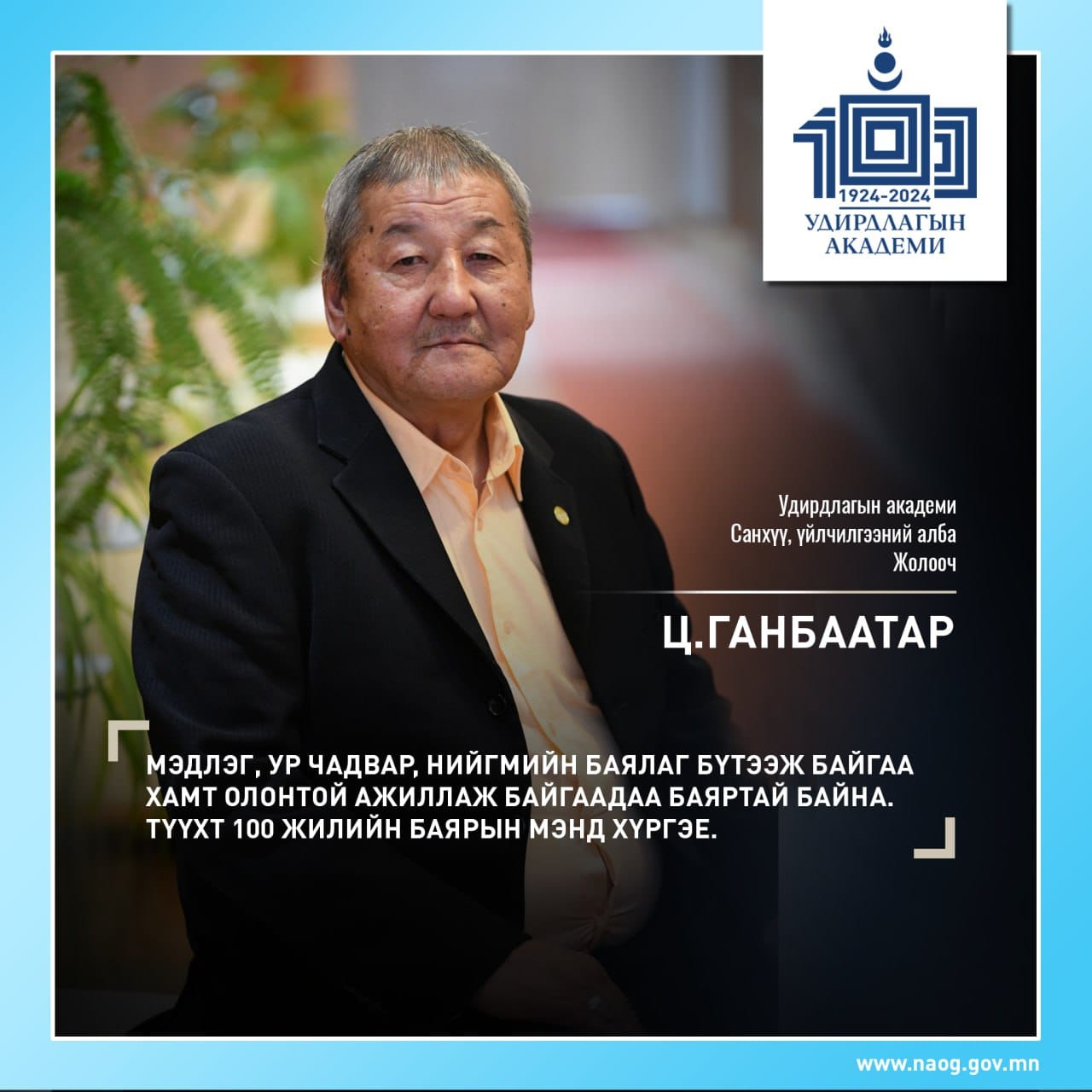 - Орчин цагийн төрийн үйлчилгээний албаны сургалтын тогтолцоо үүсч хөгжсөний 100 жилийн ой буюу Удирдлагын академийн ойд зориулав.