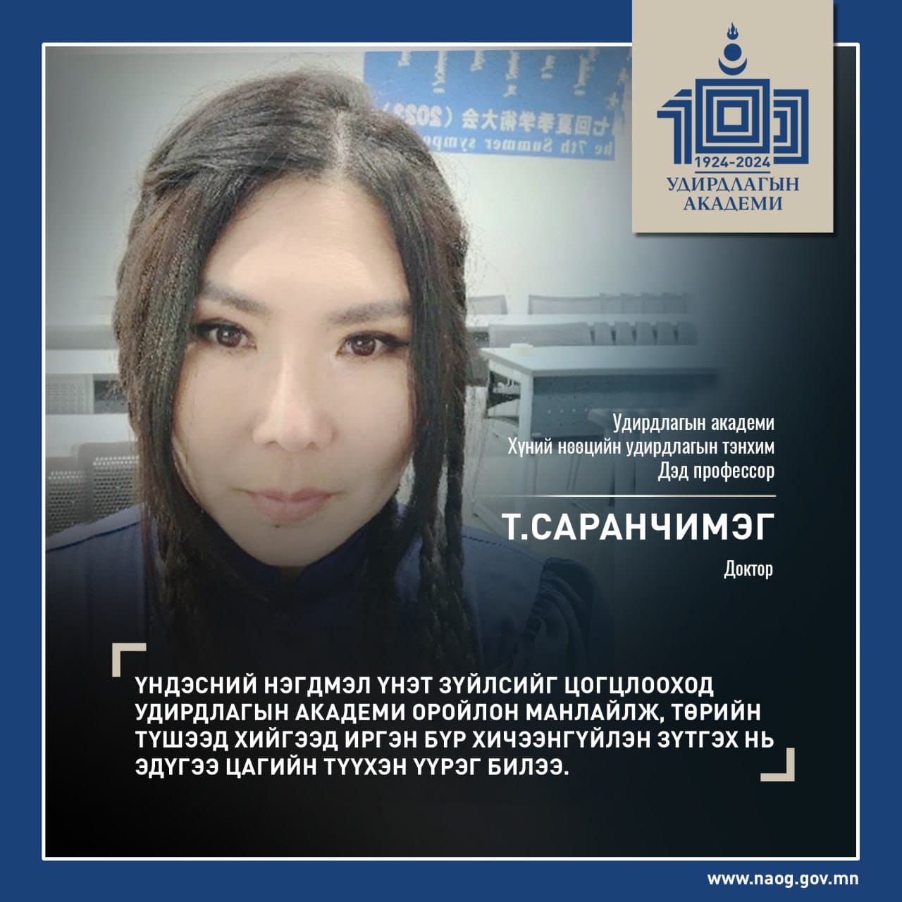 - Орчин цагийн төрийн албаны сургалтын тогтолцоо үүсч хөгжсөний 100 жилийн ой буюу Удирдлагын академийн ойд зориулав.