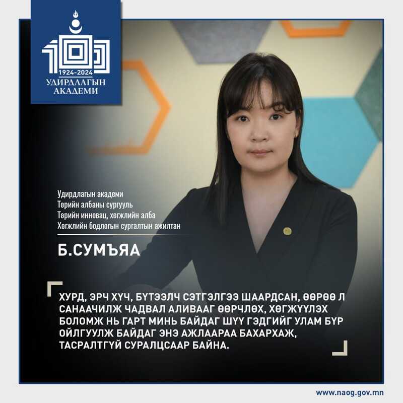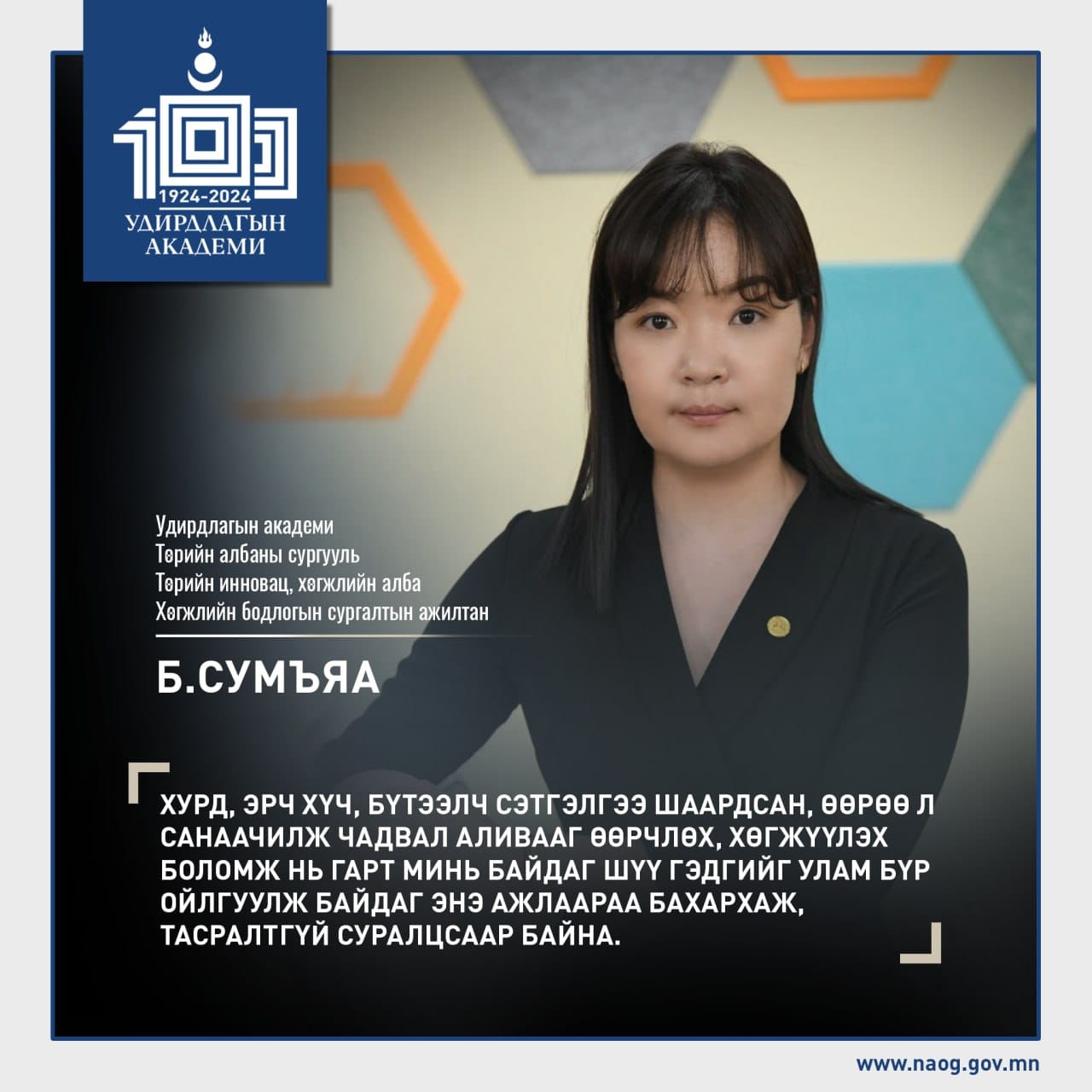 Удирдлагын академи Төрийн албаны сургууль, Төрийн инноваци хөгжлийн алба Хөгжлийн бодлогын сургалтын ажилтан Б.Сумъяа