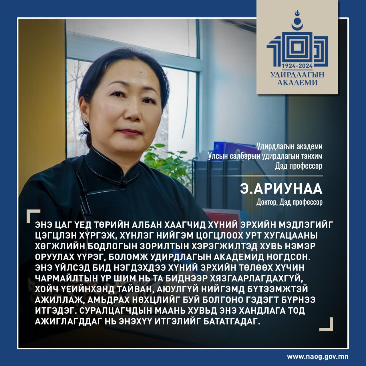 - Удирдлагын академи Улсын салбарын удирдлагын тэнхим Дэд профессор Э.Ариунаа