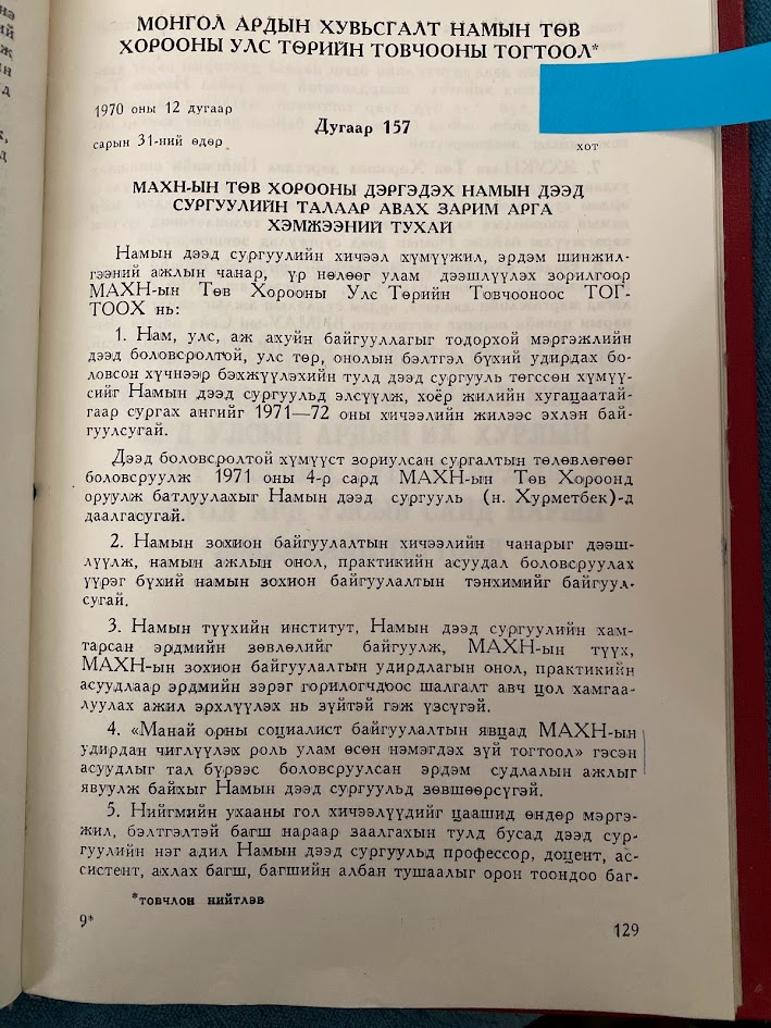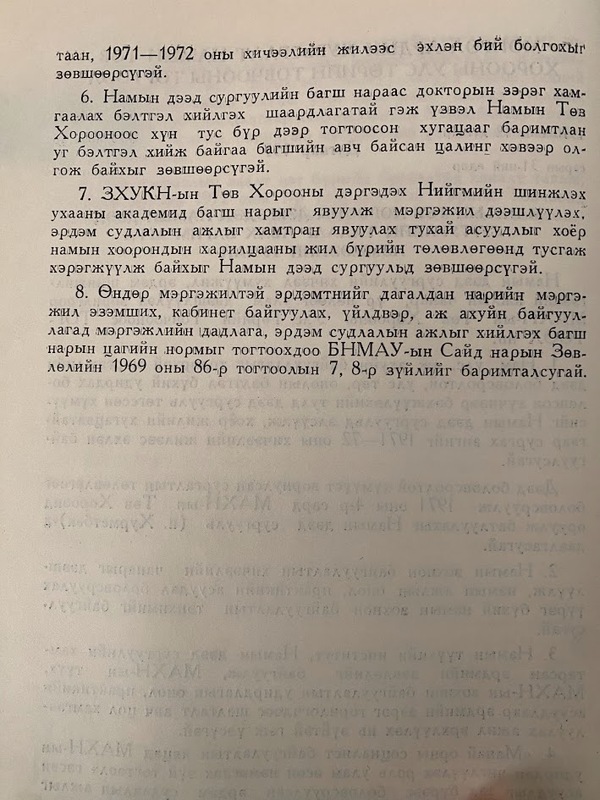 - Намын дээд сургуулийн талаар авах арга хэмжээ: 2 жилээр сургах, Эрдмийн зөвлөл байгуулах, тэнхим байгуулах, бусад