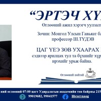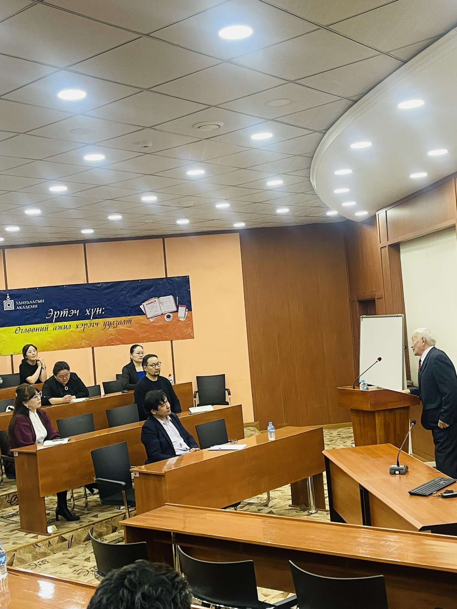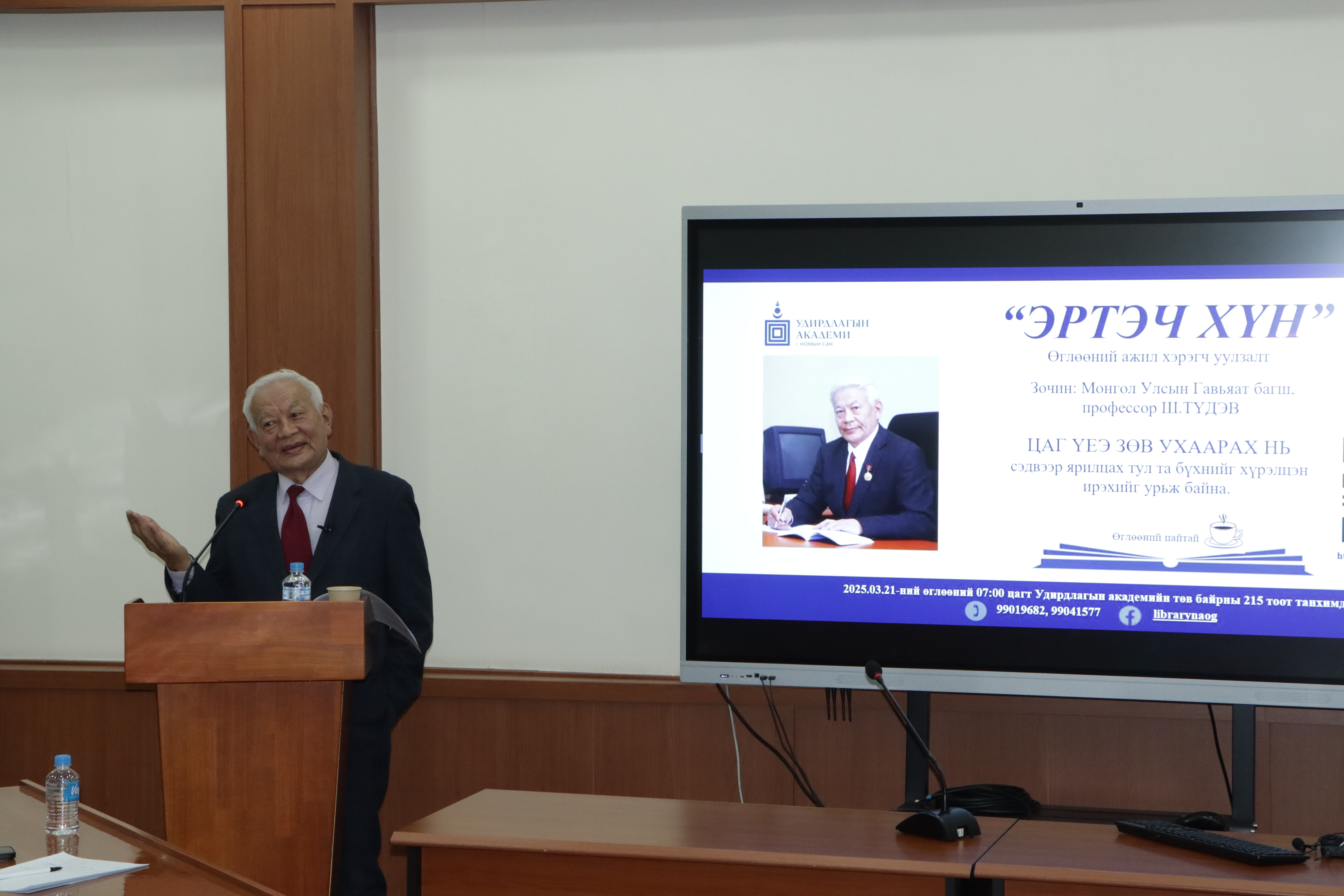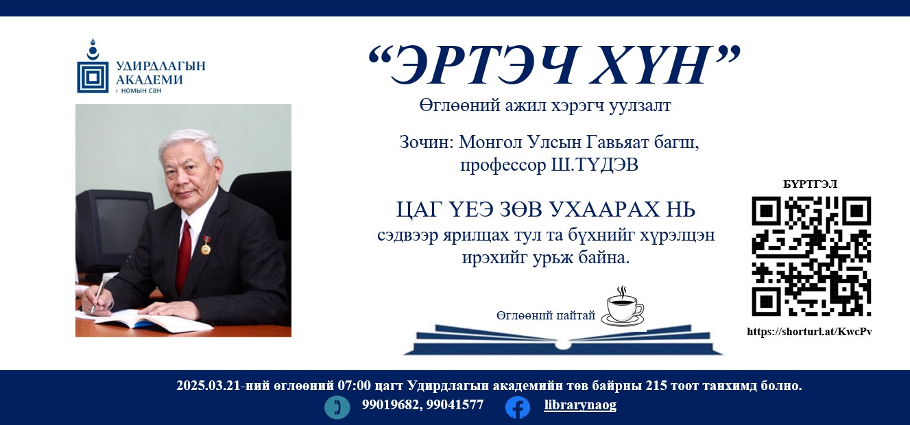 Удирдлагын академийн номын сангаас уламжлал болгон зохион байгуулдаг “Эртэч хүн” өглөөний ажил хэрэгч уулзалтын ээлжит зочноор илтгэгчээр Монгол Улсын Гавьяат багш Шадравын Түдэв оролцлоо. Уулзалт, ярилцлага өнөө өглөө буюу 2025 оны 03 дугаар сарын 21-ний өглөөний 07:00-08:30 цагийн хооронд Академийн төв байранд болж үйл ажиллагааг Удирдлагын академийн захирал дэд профессор, доктор Д.Сүрэнчимэг нээж үг хэллээ.
