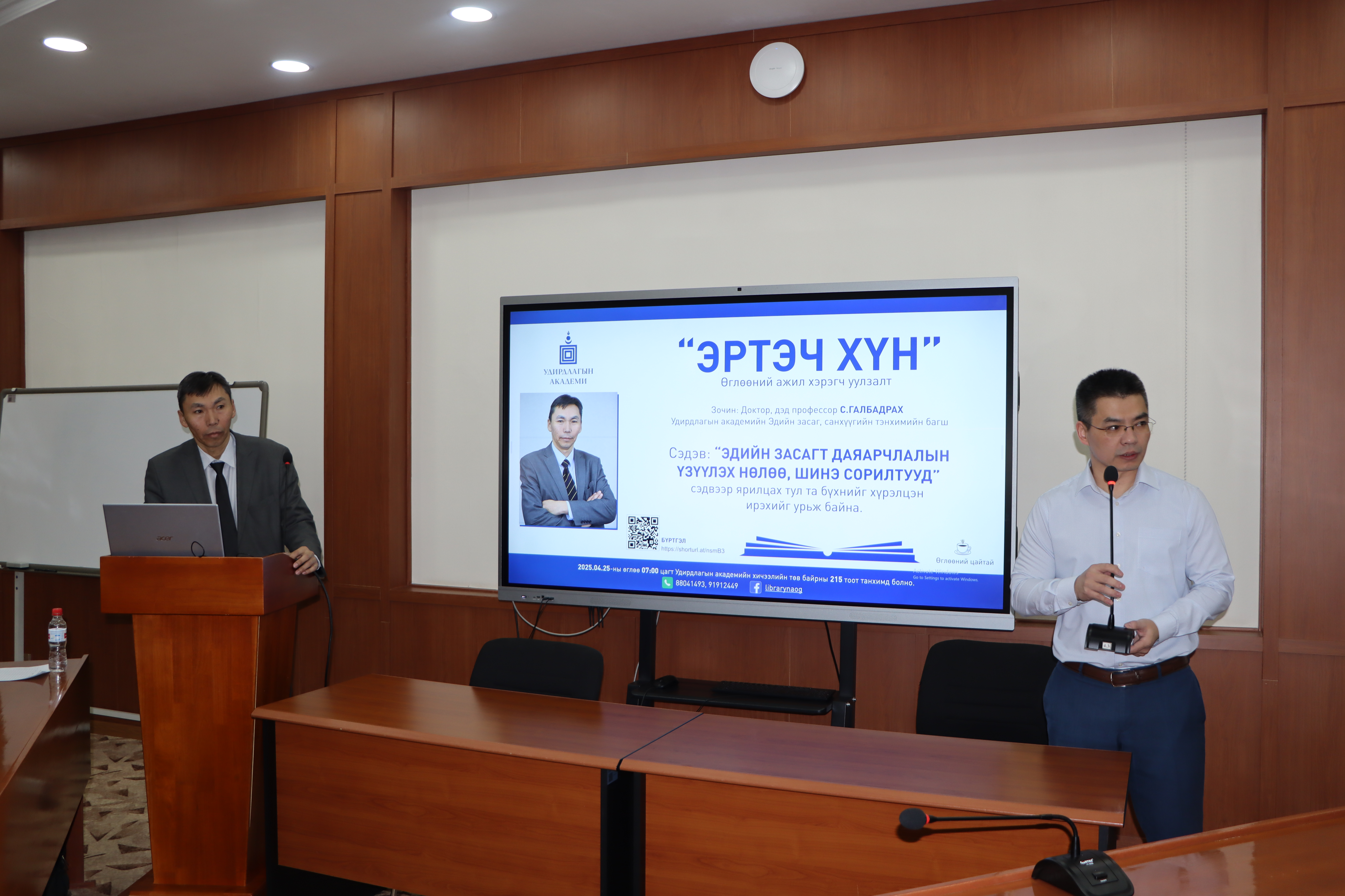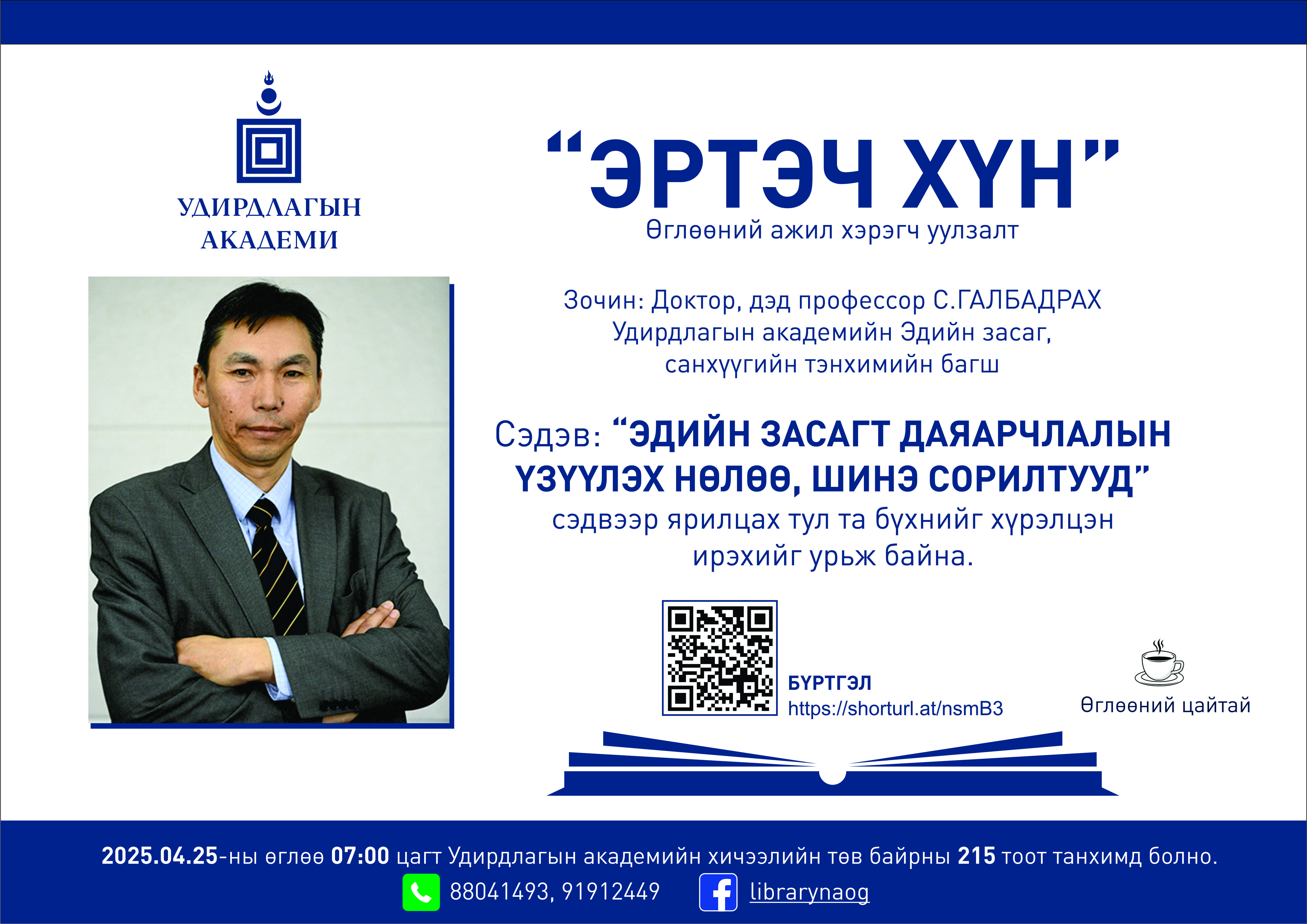 - Удирдлагын академийн номын сангаас уламжлал болгон зохион байгуулдаг “Эртэч хүн” өглөөний ажил хэрэгч уулзалтын ээлжит зочноор Удирдлагын академийн Эдийн засаг, санхүүгийн тэнхимийн багш, доктор (Ph.D), дэд профессор С.Галбадрах уригдан оролцлоо.