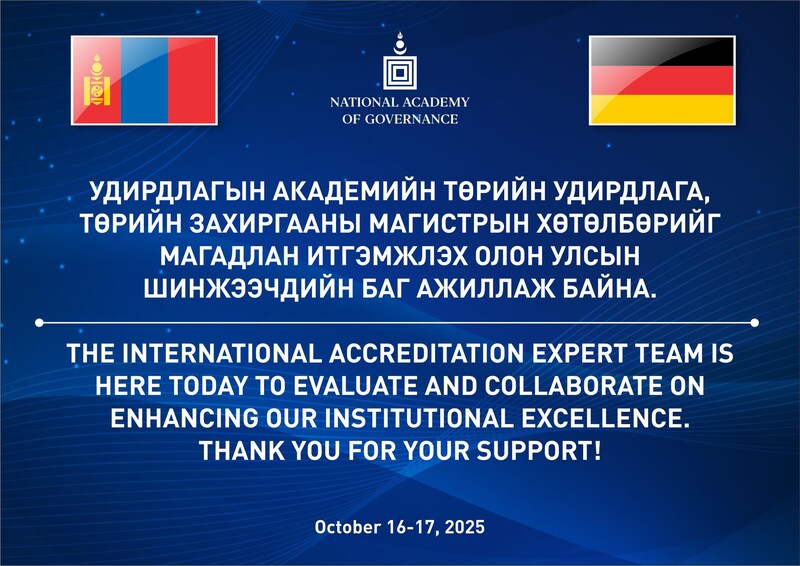 Удирдлагын академийн 2025-2028 оны стратеги төлөвлөгөөний “Боловсролын зэргийн сургалтын чанарыг нэмэгдүүлнэ” гэсэн стратегийн зорилтын хэрэгжилтийг ханган “Төрийн захиргаа”, “Төрийн удирдлага”-ын магистрын хөтөлбөрийг олон улсын түвшинд магадлан итгэмжлүүлэх ажлыг амжилттай зохион байгууллаа.