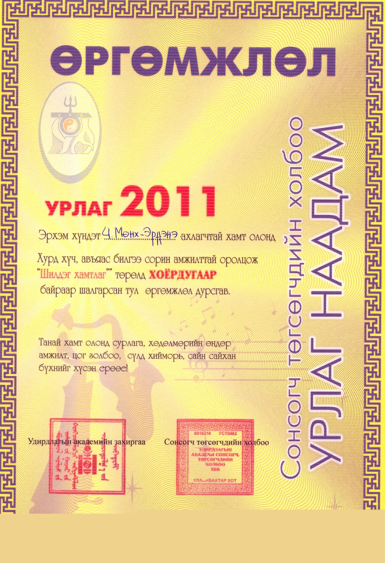 - Удирдлагын академийн суралцагч, сонсогчдын дунд урлагийн үзлэгийн өргөмжлөл
