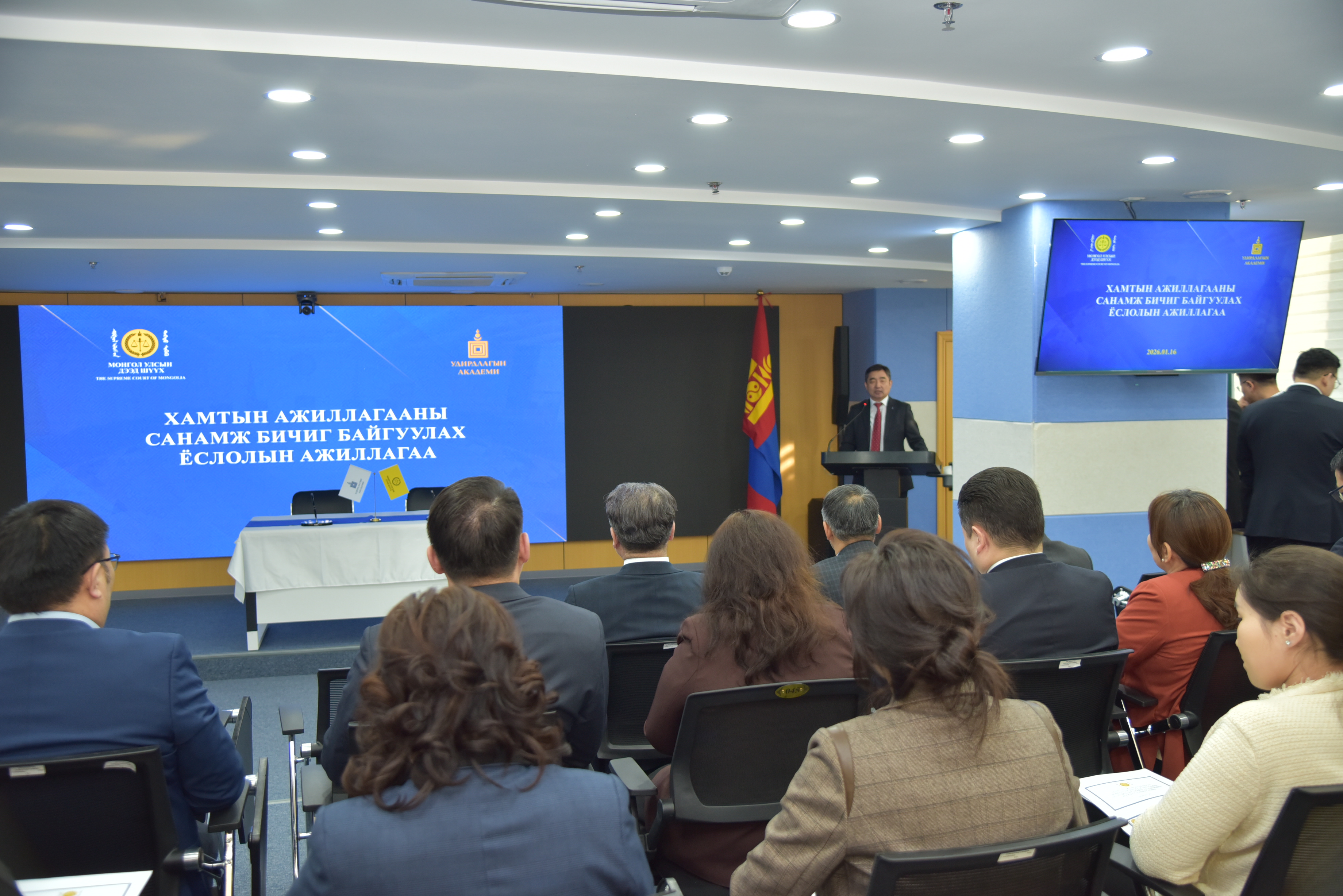 Монгол Улсын дээд шүүхийн Тамгын газраас 2026 оны 01 дүгээр сарын 16-ны өдөр зохион байгуулсан ном, бүтээл танилцуулах, солилцох, судалгааны санг баяжуулах, номын сангуудтай туршлага солилцох, хамтран ажиллах зорилготой номын өдөрлөгийн үеэр Удирдлагын академийн захирал, доктор, профессор Д.Байгал, Монгол Улсын дээд шүүхийн Тамгын газрын дарга С.Заяадэлгэр нар Хамтын ажиллагааны санамж бичиг байгуулж гарын үсэг зурав.