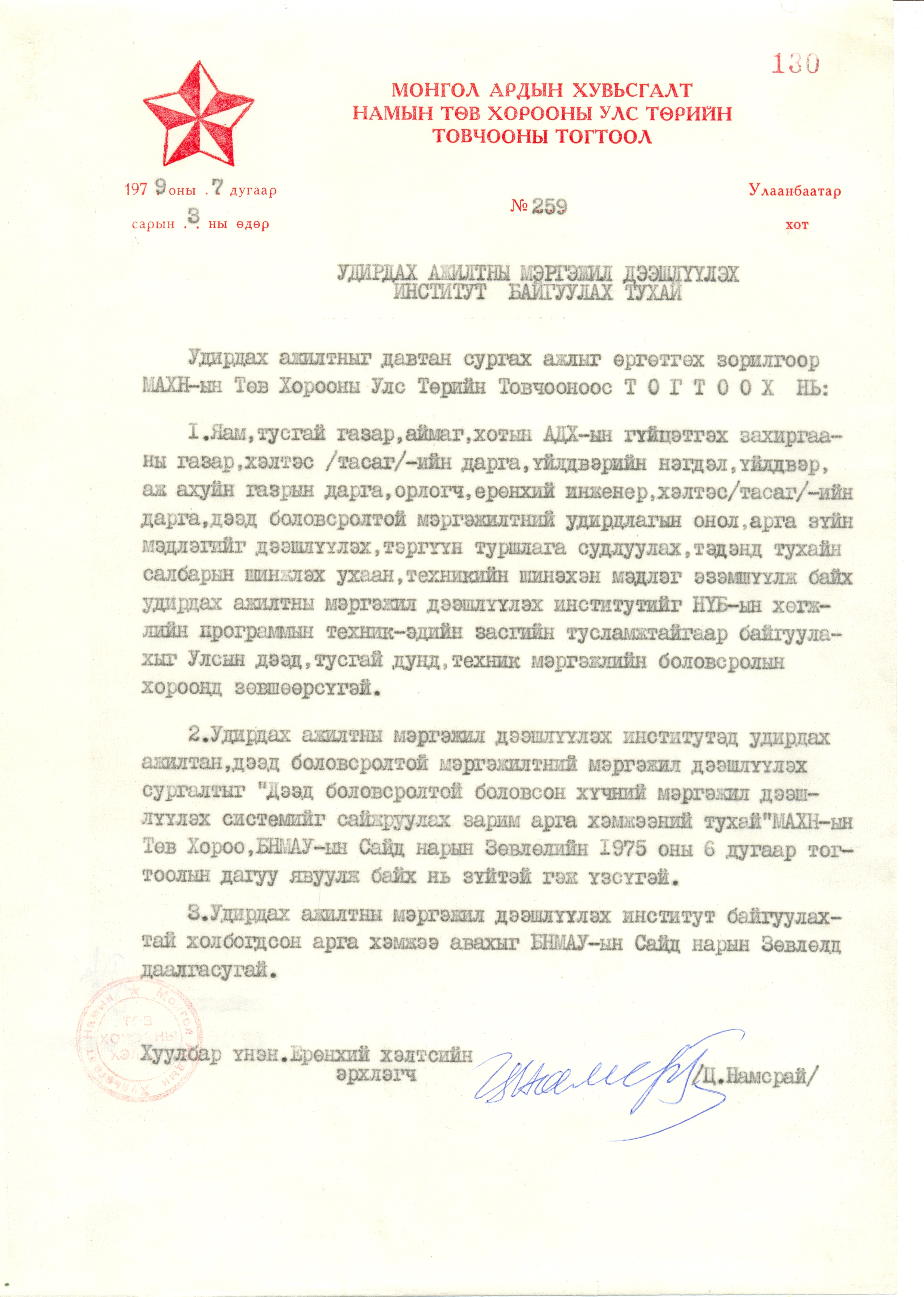 - МАХН-ын төв хорооны улс төрийн товчооны тогтоол, 1979 оны 7 дугаар сарын 3-ны өдөр 259 дугаар тогтоол