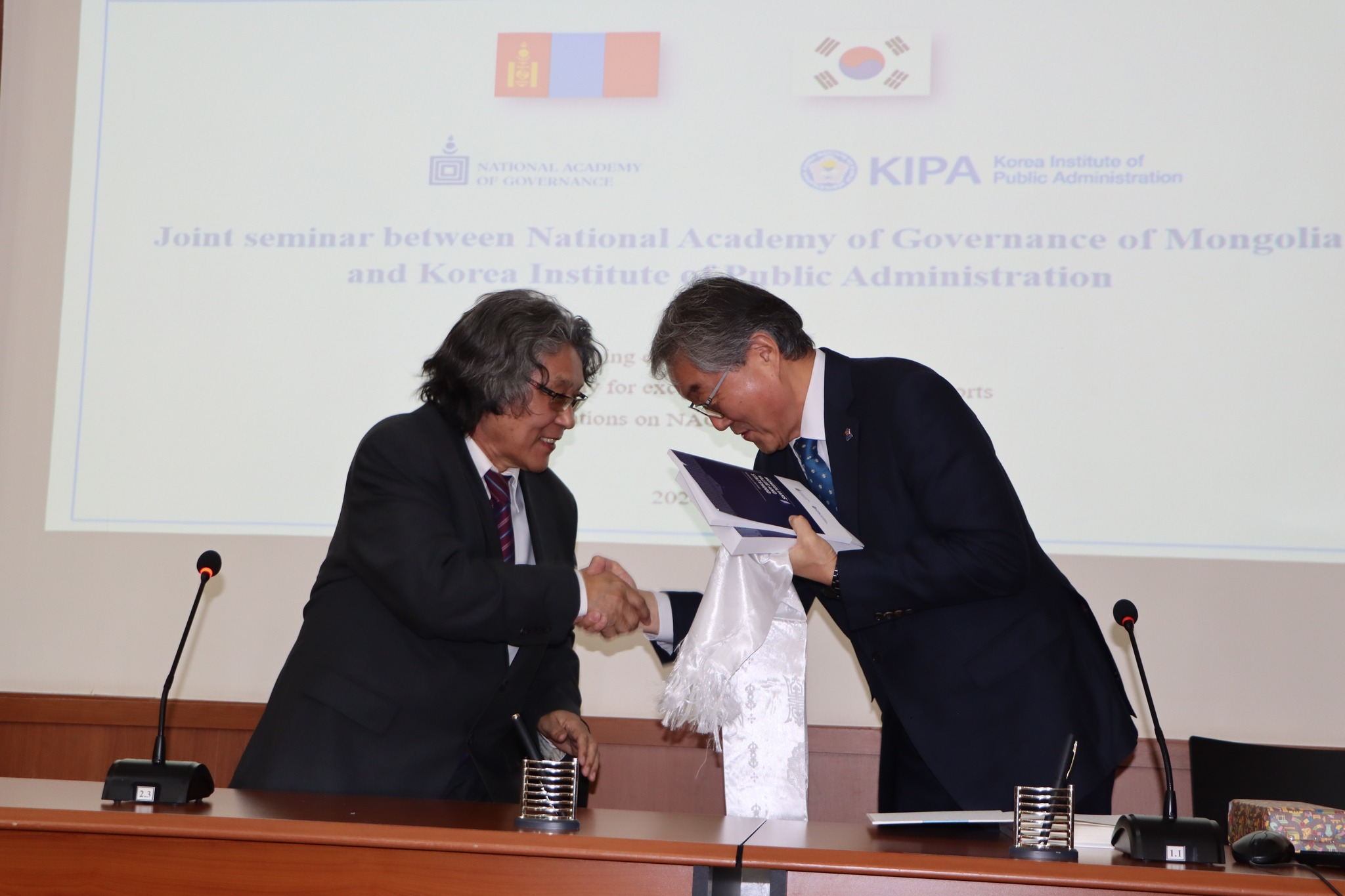 Уулзалтын эхний өдөр хоёр байгууллагын хамтран хэрэгжүүлсэн “Монгол Улсын төрийн албаны эрхэмж, уламжлал, удирдлагын манлайллын талаарх олон нийтийн төсөөлөл” судалгааны төслийн тайланг хүлээн авах ёслолын үйл ажиллагаа болж Удирдлагын академийн талаас төслийг удирдсан профессор Я.Долгоржав, БНСУ-ын Төрийн захиргааны институтийн талаас ерөнхийлөгч, доктор Чой Санг Хан нар монгол, англи, солонгос хэл дээр хэвлэгдсэн судалгааны тайлангаа солилцлоо.