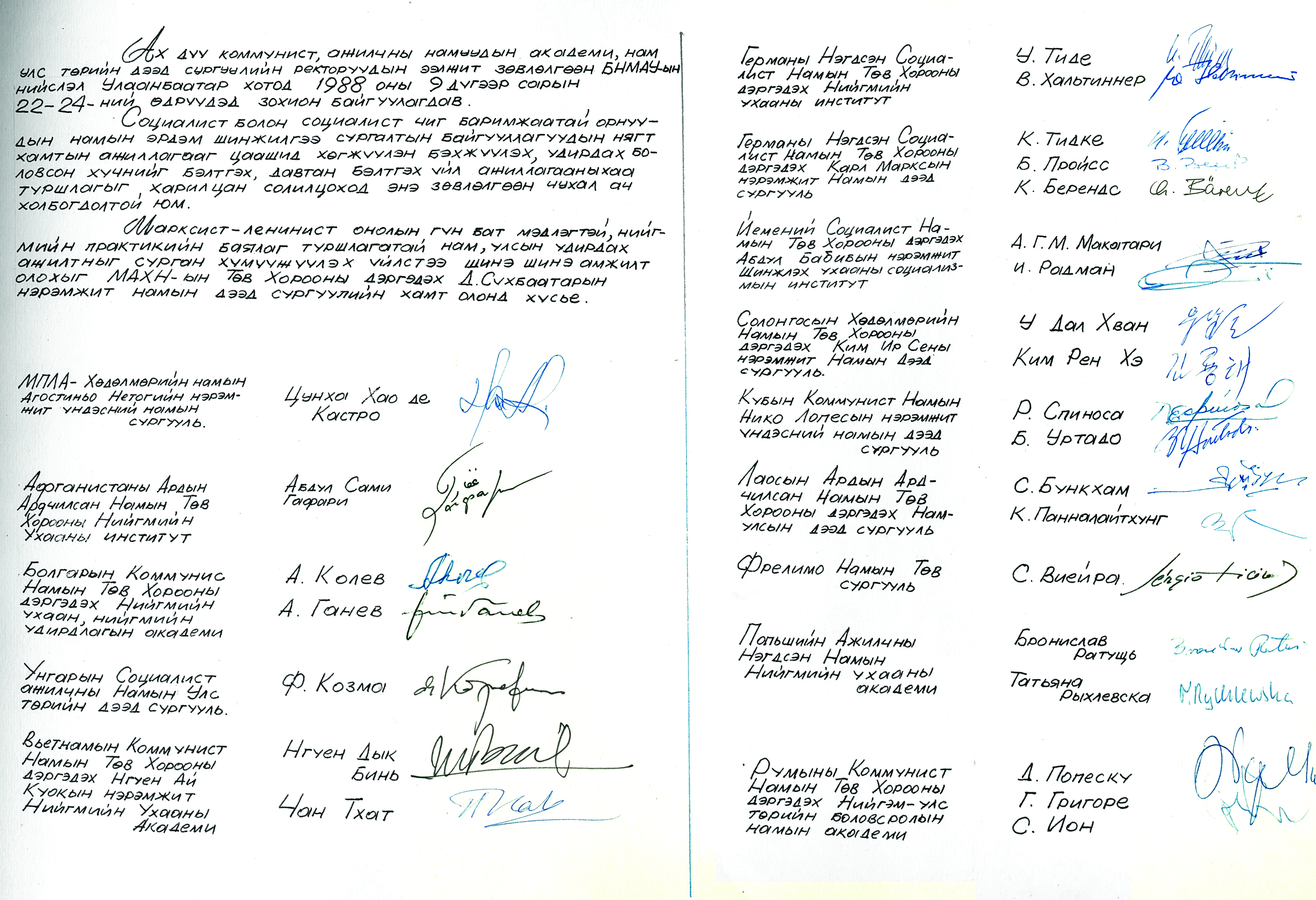 - 1988 онд НДС нь Улаанбаатар хотод болох социалист орнуудын Намын дээд сургуулийн ректоратуудын зөвлөлгөөний бэлтгэлийг хангаж, улмаар уг зөвлөлгөөнийг амжилттай зохион байгуулав. Энэхүү зөвлөлгөөнд социалист болон социалист чиг баримжаатай орнуудын намын боловсон хүчинг сурган бэлтгэдэг 21 байгууллагын төлөөлөгчид оролцож, өөрчлөн байгуулалтын тулгамдсан асуудлууд, хандлагыг онол-арга зүйн үүднээс шинжлэн судалж сургалтын агуулгыг баяжуулах, намын дээд сургууль, академиудын хамтын ажиллагааг өргөжүүлэн гүнзгийрүүлэх арга замуудыг тодорхойлсон байна.